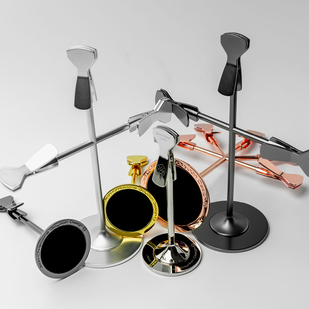 Personnalisez votre porte-mouillettes grâce à un choix de multiples teintes : or brillant ou mat, inox, noir brillant ou mat, or rose, blanc mat... ainsi qu'une gravure de votre logo (pinces et socles).