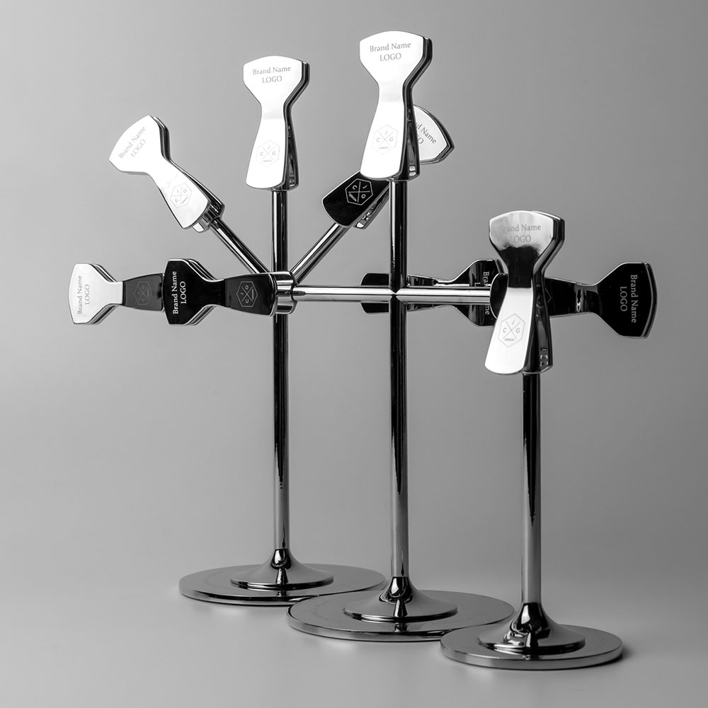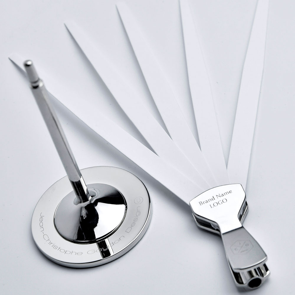 Personnalisez votre porte-mouillettes grâce à un choix de multiples teintes : or brillant ou mat, inox, noir brillant ou mat, or rose, blanc mat... ainsi qu'une gravure de votre logo (pinces et socles).